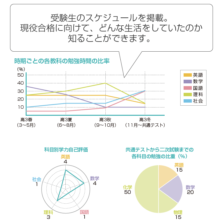 また、私は共通テストが終わってから二次試験までの間に長い受験生活に疲れて息切れしそうになっていましたが、そんな時に自分以上に努力している友達や、推薦入試がダメでも、すぐに前期試験に切り替えて頑張っている友達を見て、私もそれに影響を受け、なんとか最後まで頑張ることができました。