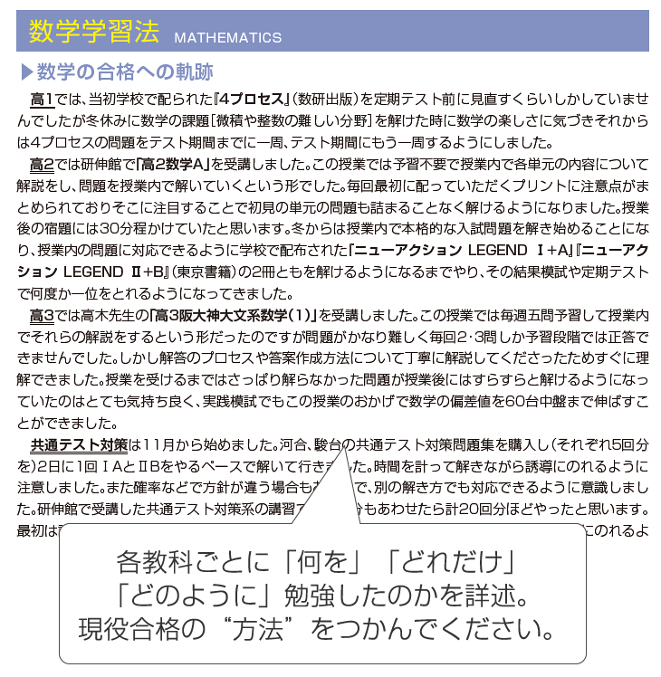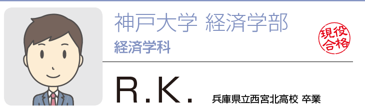 理由:神戸大学に行こうとは高2の夏ぐらいには決めていましたが、その当時は学部までは決めていませんでした。自分は数学が得意とはいいきれないのですが、高2の冬ぐらいに難しい問題を自力で解いた時に達成感を感じて(数学が)好きになり始めて大学に入ってからも文系でそれを活かせる(関西で一番定評のある)神戸大学経済学部を選びました。また経済学部では入試の時に数学選抜というものがあり、その機会を活かすことができる可能性があったということも理由のひとつです。