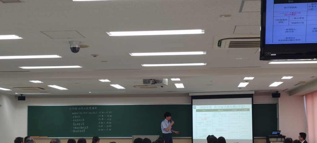 9/7(日)に愛知医科大学・大阪医科薬科大学・関西医科大学・近畿大学・兵庫医科大学(五十音順)が一堂に会し、Medi-UP(メディアップ)上本町校にて合同の入試説明会を行いました。多数の生徒・保護者にご参加いただきました。兵庫医科大学医学部入試課の方より大学の特色、2026年度入試変更点を中心にお聞きしました。