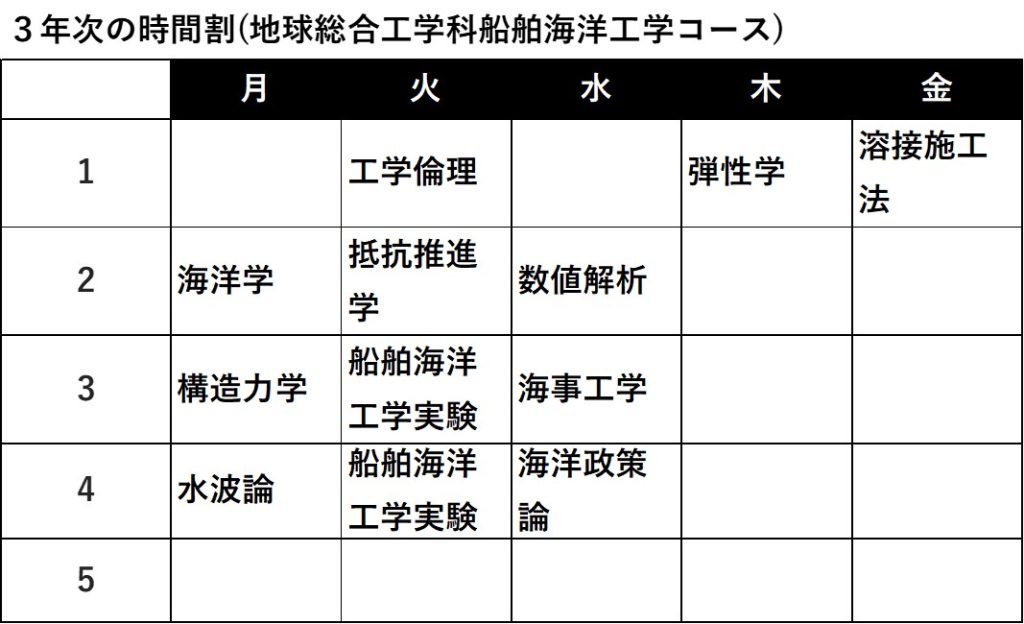 ①講座名:船舶設計製図 担当:澤村先生NAPAという船舶専用設計ソフトを使用して、船舶を設計したり船舶の分析をしたりする授業です。複雑な公式を用いてエクセルに船舶のデータを計算・入力し、そのデータをNAPAに反映させることによって設計しています。