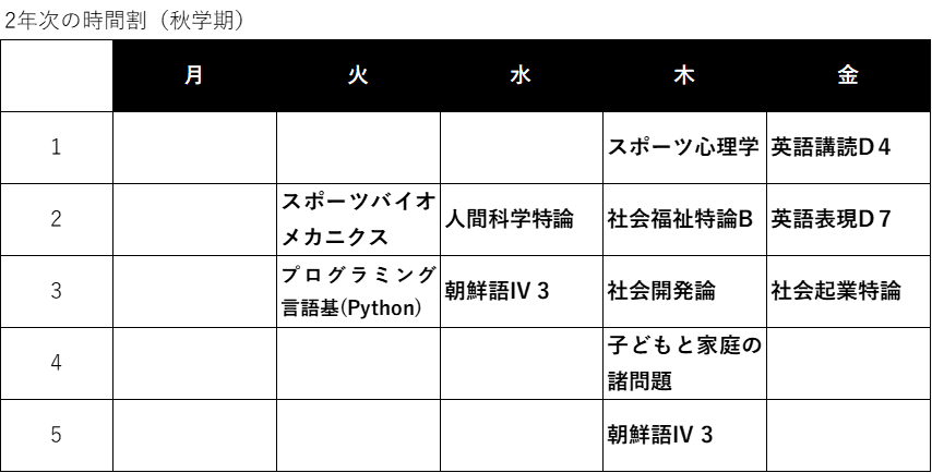 ①講座名:スポーツバイオメカニクス 担当:河鰭先生この授業は2年生の秋学期に受講できる講座で、1年生でも受講できる同じ教授の「ヘルスプロモーション概論」と2年生春学期から受講できる「運動生理学」の授業と非常に関連している授業です。授業内容としては、教授の専門分野である骨や筋の仕組み・スポーツをした際に身体がどのような刺激を受けるのかなど、力学・生物学・生理学の知見を学ぶことができます。大学の授業は堅苦しいものが多いですが、教授の講義内容以外の話も非常に面白く、教授が体験した様々な話を聞くことができて楽しく授業を受けることができます。スポーツが好きな方や、人体の仕組みに興味がある方におすすめの講義です。