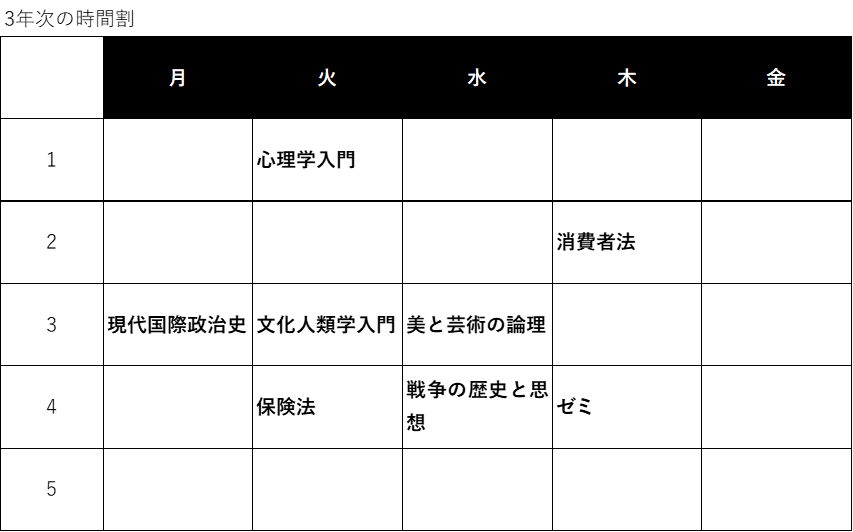 ■金曜日の過ごし方: 全休の日は、家で勉強したり、友人とカフェ巡りをしたり、自由に過ごしています。
