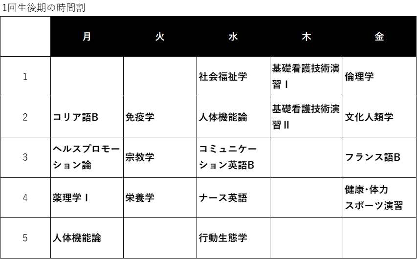 これは看護学部特有の授業で、ベッドメイキング、寝衣交換、清拭、洗髪、足浴、血圧などのバイタルサイン測定、採血などを実践形式で学ぶ演習の授業です。毎回、予習して援助計画を立てたりと授業の準備からやることがたくさんあり、授業はナース服に着替えて行ないます!学ぶことがとても多く、大変な授業ではありますが先生方がとても熱心に指導してくださり、一番「看護の勉強をしているな~」と感じる授業でもあります。