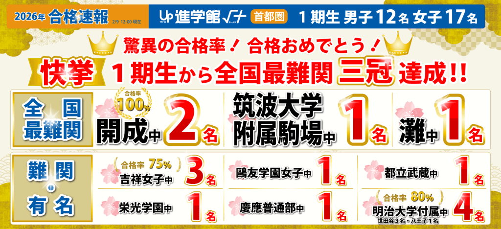 🏅 筑波大学附属駒場中:2名(合格率100%) 🏅 開成中:2名(合格率100%) 🏅 灘中:1名(合格率100%) 🏅 吉祥女子中:3名(合格率75%) 🏅 鷗友学園女子中:1名(合格率100%) 🏅 都立武蔵中:1名(合格率100%) 🏅 栄光学園中:1名(合格率100%) 🏅 慶應義塾普通部:1名(合格率100%) 🏅 明治大学付属中:4名(合格率80%)