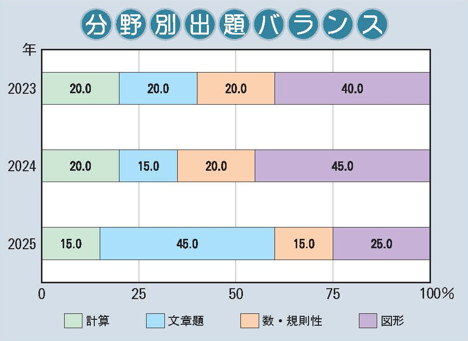 昨年は水そうに関する問題が2つの大問で出題されていたこともあわせて考えると、対策は必須である。大問1の計算問題、大問2~4の文章題や平面図形の問題と数に関する問題は、確実に正解して得点源にしたい。