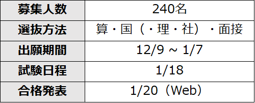 2科目または4科目の受験を選択することができる学校である。2科目受験は片方の科目でうまく得点できなかった場合のリスクが大きいので、4科目受験の方が望ましいことが多い。