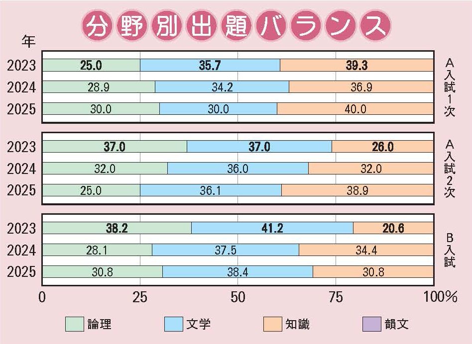 全体を通じて記述問題の出題が増えており、A入試1次では70字以内の記述問題が出題された。