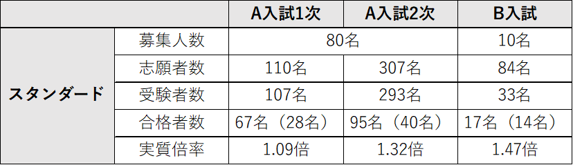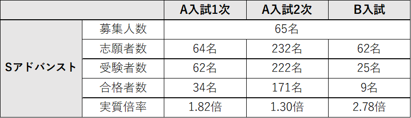 A入試1次はどちらのコースも倍率は例年並み、A入試2次ではSアドバンストコースが昨年度より落ち着いた倍率となった。