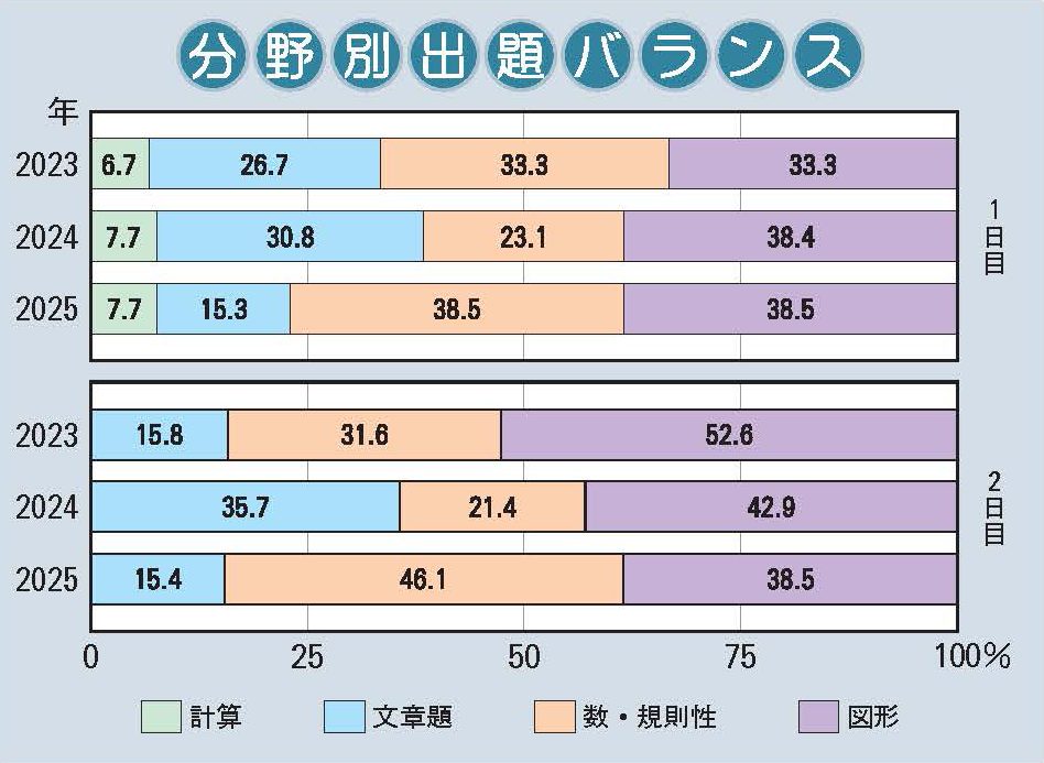2日目は、速さとグラフ、作図必須の平面と立体図形、試行錯誤を要する数の問題が出題された。中でも差がついた数の問題は、誘導にのりながら慎重に解きすすめると、最後の問いにつながる内容であった。