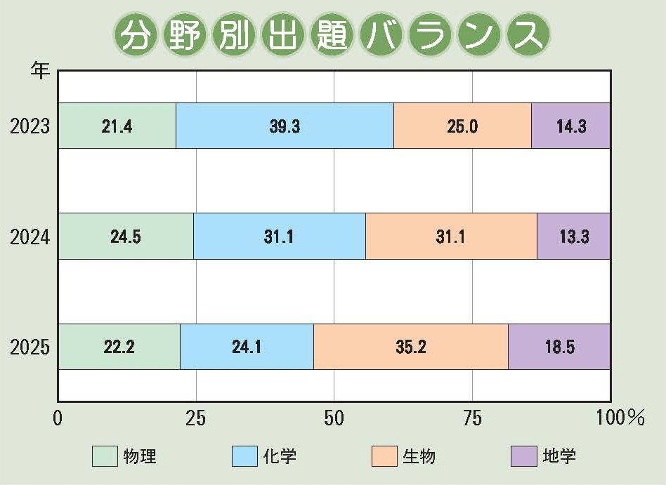 ①出題内容例年は、物理・化学が2題、生物・地学が1題だが、化学が1題となった。