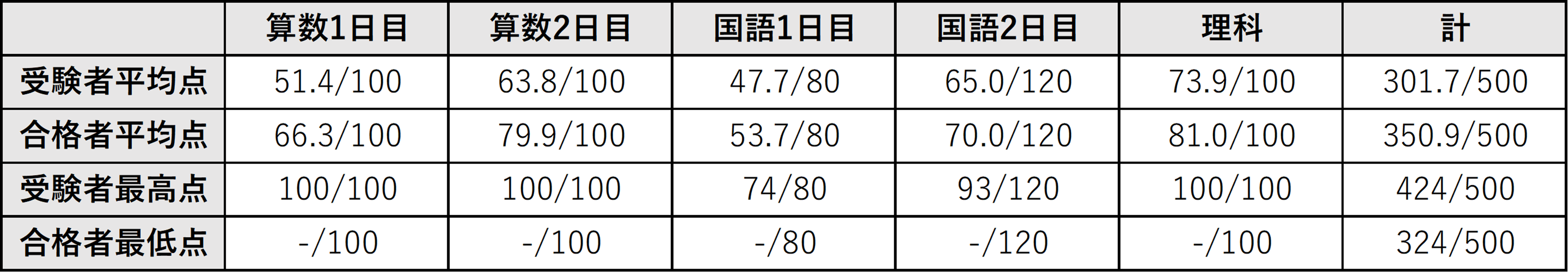 合格者平均点は、国語は両日合わせて10点近く低かった。v算数は2日合計で見るとほとんど変化はないが、1日目と2日目で難度に開きがあった。