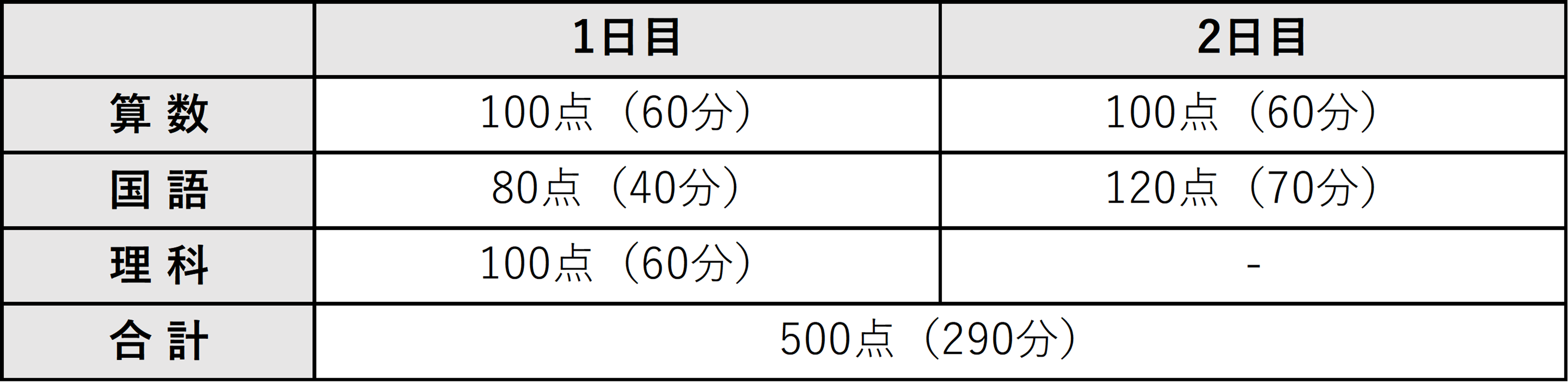 1日目…語句問題を中心とした文章題1題・語句などに関する大問5題。2日目…文章題2題・詩1題。
