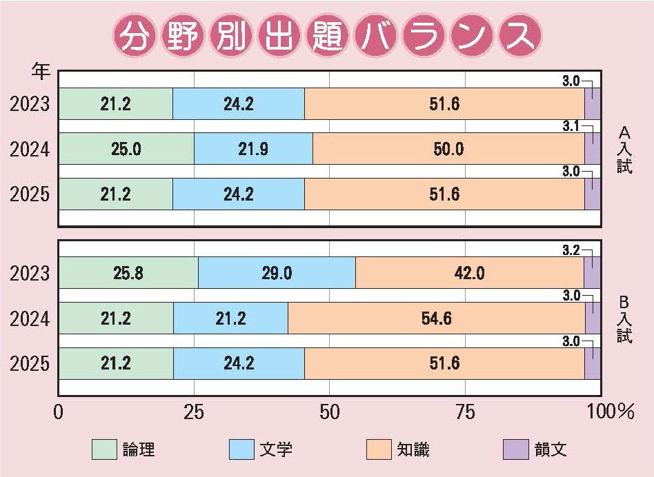 A入試の問題数は昨年度と同じだが、B入試は昨年度より問題数が増えた。例年通り典型問題も出題されたが、思考力を問う問題も出題された。「リニアモーターカーの仕組み」や「イネの種子の実験」のような、受験生には見慣れないテーマの問題が出題されたが、標準レベルの読み取り問題だった。