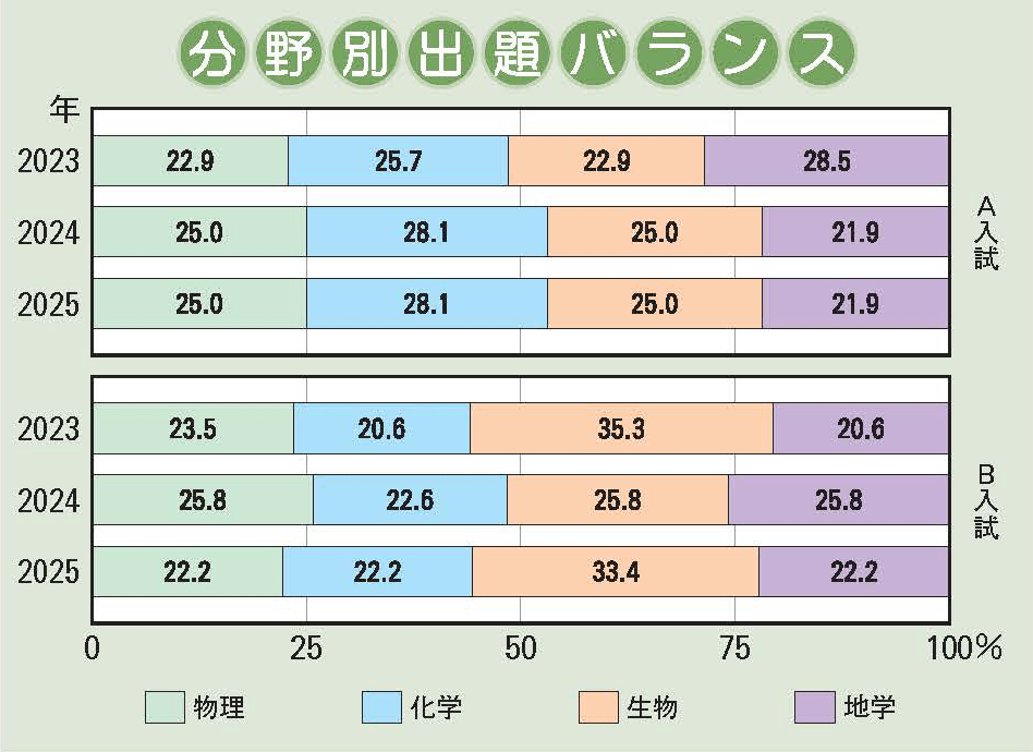 A入試、B入試共に物理・化学・生物・地学1題ずつの出題であった。