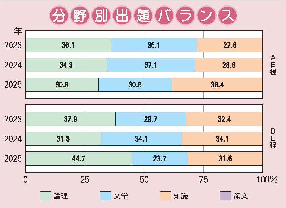 例年通りA・B日程ともに、大問1に論説文、大問2に物語文、大問3に漢字の書き取り問題が独立した形で出題された。対策の中で気をつけるべきことは、高難度の記号問題である。今年度は、文章題自体の難度も高く、一段と選択問題で正確な読解が求められた。またA日程の論説文の問9で出題された、新傾向の問題にも注目だ。複数の生徒に話し合いをさせ、そのセリフをヒントに、空所をうめていく形式の問題である。本文内容を正確に理解するだけでなく、設問の誘導にうまく乗る必要があり、問題作成者の意図をくみとれるかどうかが、合格するための大きなポイントになったと考えられる。