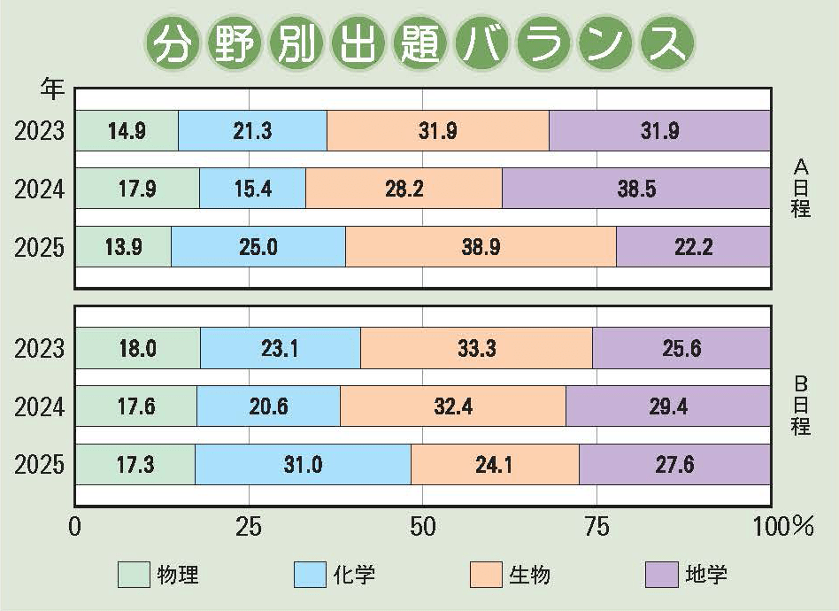 昨年と同様、A日程・B日程ともに大問数は4題で、物理・化学・生物・地学分野から各1問ずつの出題であった。