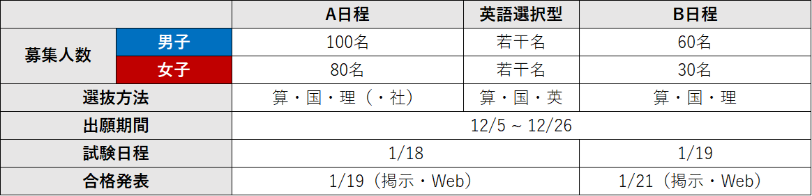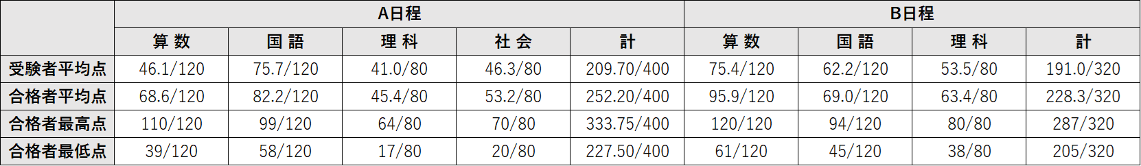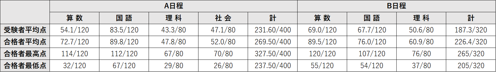 また、合格者平均点については、A日程で前年度と比べ大幅に低下した。近年、特に図形や規則性などの単元で大幅な難化がみられる。志望者は、複雑な計算問題を確実に合わせる練習をすることはもちろんのこと、「平面図形と比」「立体図形」「規則性」の難問にできるだけ多く触れ、十分に対策をして挑んでほしい。