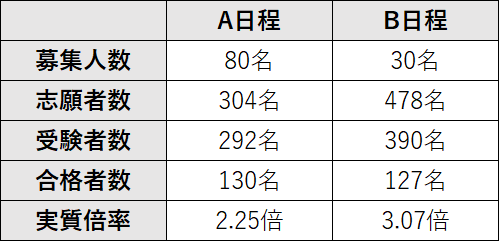 年々志願者数が増えている高槻中学。今年もA日程は男女ともに志願者が増え、その結果、男子の実質倍率は3.1倍で過去最高となった。B日程も男女ともに多くの志願者が集まり、狭き門であった。併願校との兼ね合いもあり、A日程は男子、B日程は女子の方が実質倍率は高い結果であった。