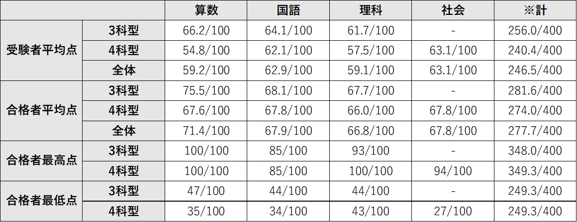昨年度は算数・国語の問題が難しく平均点が低かったことから、今年度は算数・国語の難易度が抑えられ、平均点が10点近くアップし、それに応じて全体の平均点も20点近くアップした。合格者平均点は7割近くになることが多い学校なので、取りこぼしがないよう、きちんと得点を積み重ねていく必要がある。