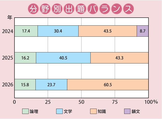 今年度も、昨年度と同様に文学的文章・論理的文章がそれぞれ1題ずつという構成で、詩が出題されなかった。