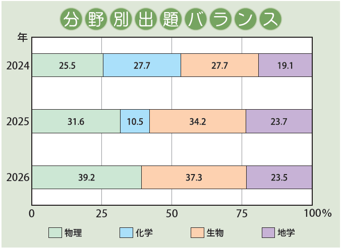 物理と生物と地学が2題ずつ、合計6題の出題で、化学の出題がなかった。