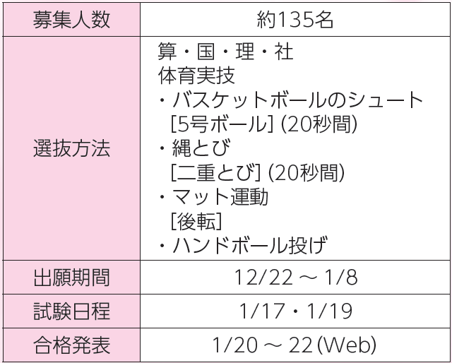 1日目(土曜日)に4科目のテスト、2日目(月曜日)に体育実技テストが行われた。合格最低点は、250点→248点と昨年度とほぼ同じであった。合格者数は昨年度と同じ154名で、受験者数が昨年度より37名減ったため、倍率も下がった。科目別に見ると、算数は図形問題が増加し、後半に進むにつれて難問が増えてくるという構成であった。国語は読解問題の文章量は多かったが、文章量以外は例年よりは取り組みやすくなっていた。理科は学校教科書に載っている生物に関する問題や、日本地理の知識が必要な難問も出題された。社会は小問数が増加し、例年より難しい問題が多かった。過去問をしっかりと解きこむことと、標準レベルまでの問題をきっちりと合わせきることが重要である。
