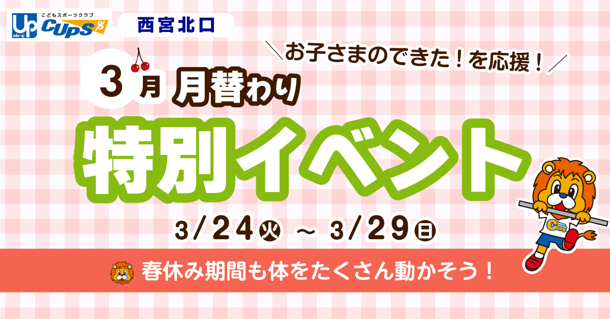 こどもスポーツクラブCUPS西宮北口では、「春休み期間も体をたくさん動かそう」を合言葉に、1週間だけの特別イベントを開催します!
