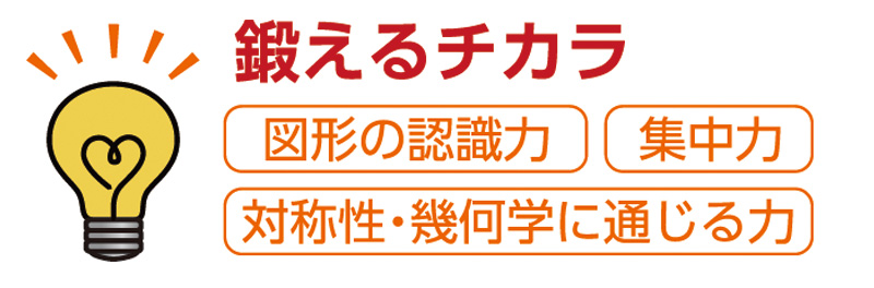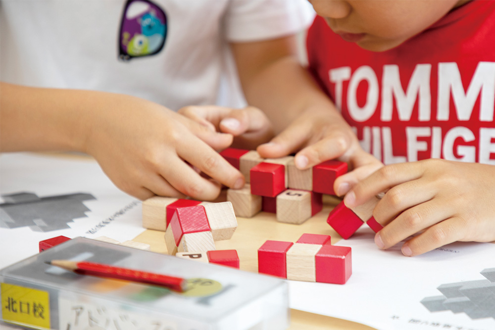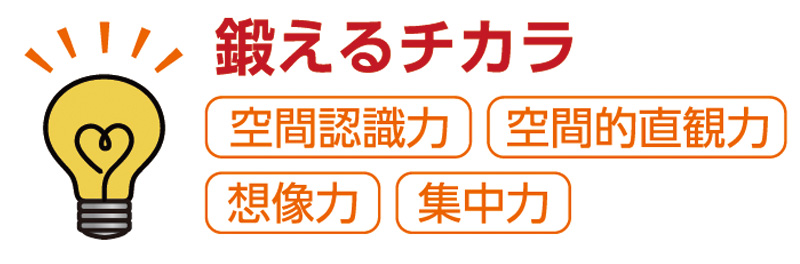 空間認識能力は図形を読み取るための大切な能力ですが、実際に見たり、触れたり、作ったり…といった経験がなければなかなか身につきにくいものです。授業で使用する立体パズル「ピーキューブ」では、見えていない部分も含めて立体をイメージし、実際に手を動かしながら制限時間内に指定された立体を作り上げるトレーニングを繰り返します。これにより、確かな「空間認識能力」が身につきます。