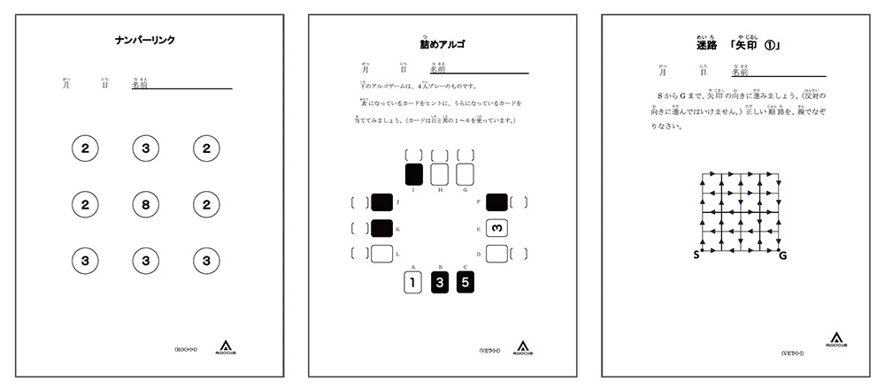 試行錯誤する力は一朝一夕には身につけることができません。早い時期からじっくりと考えさせられる良質な問題に出会っておくことが重要です。アルゴクラブで取り組むアルゴゲームやプリントやパズル教材はまさにそれに打ってつけであると言えます。