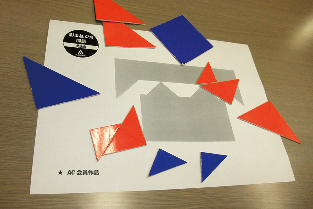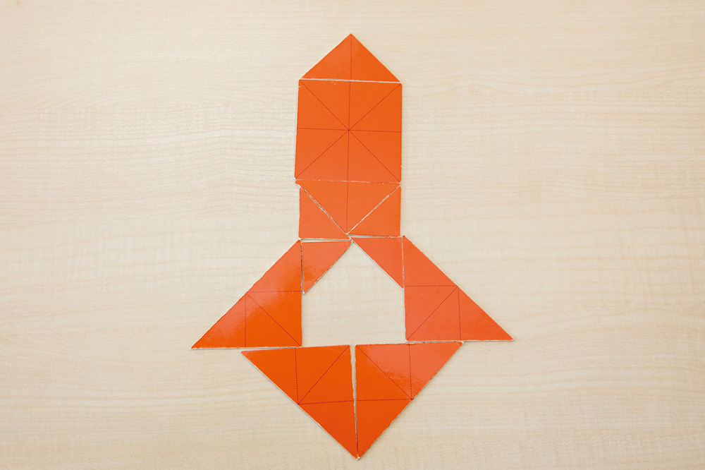 直角二等辺三角形と正三角形を用いた平面パズルです。「かげまねジオ」では、大きさや向きなどを調整しながら試行錯誤を繰り返すことで、形の感覚を養います。
