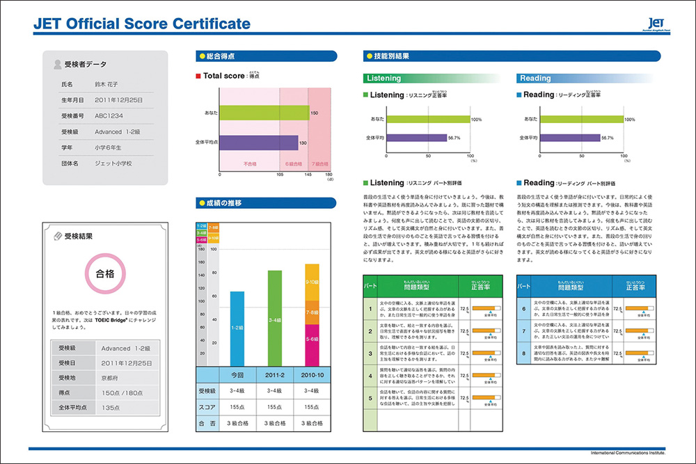 日々の学習の成果を図る“ものさし”として、Leptonでは、テキストが1冊終わるごとに理解度をチェックする「ファイナルチェック」や、TOEIC®につながるコミュニケーション英語能力テスト「JET(Junior English Test)」で英語力の習熟度を確認しています。