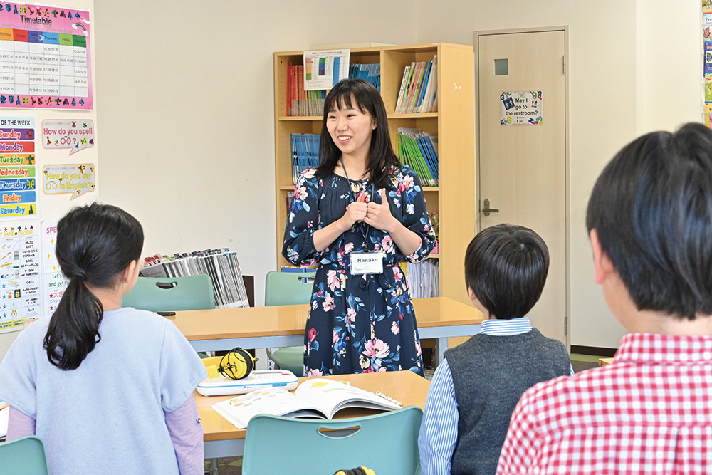 英語を文法という理屈で学ぶ中学生とは違い、小学生(特に低学年)は、耳・口・手を使って、英語を体で覚えていきます。ぱっと反射的に口から出るようになるまで、英語音声をまねて声に出す練習を何度もくり返し、先生に確認してもらう。その後、練習した文を書き写す。中学レベルの英語を使った会話フレーズをスラスラとテンポよく言える力は、こうした「聞く→話す→読む→書く」の4技能の反復練習によって身についていきます。