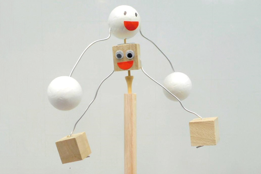 様々なやじろべえを作り、つり合いのイメージをつかみます。やじろべえにおもりをつけたり、うでをまげたりしながら、上手くバランスをとって立たせます。