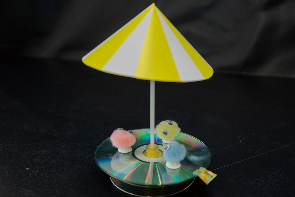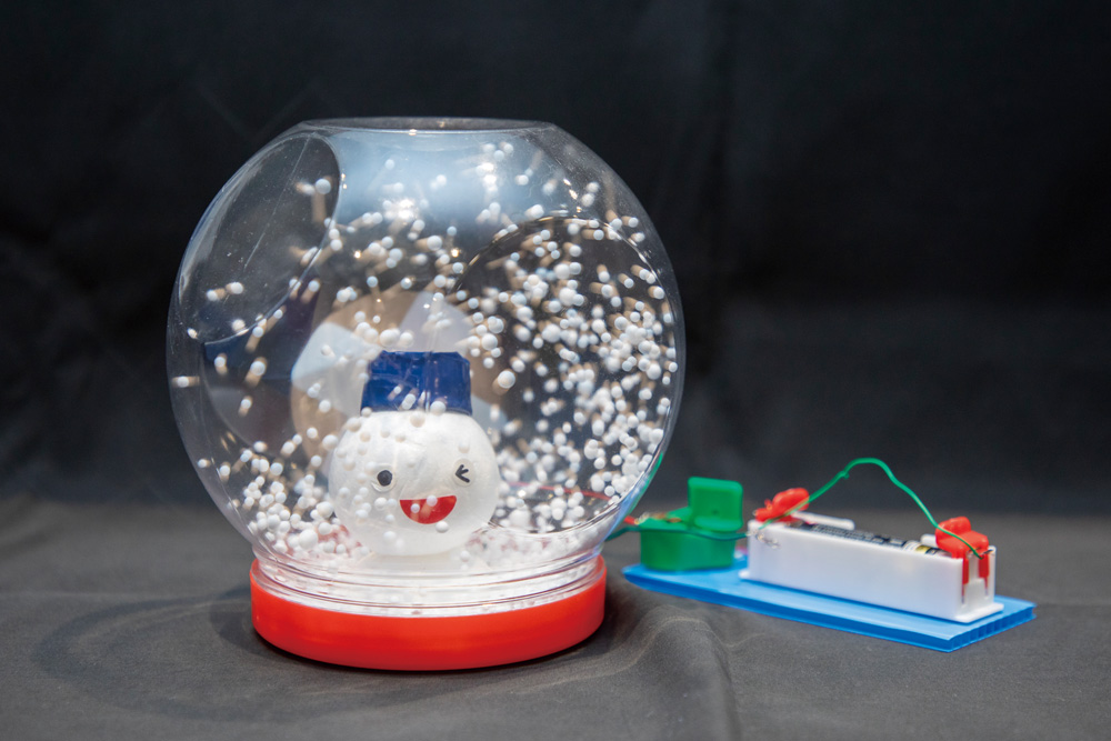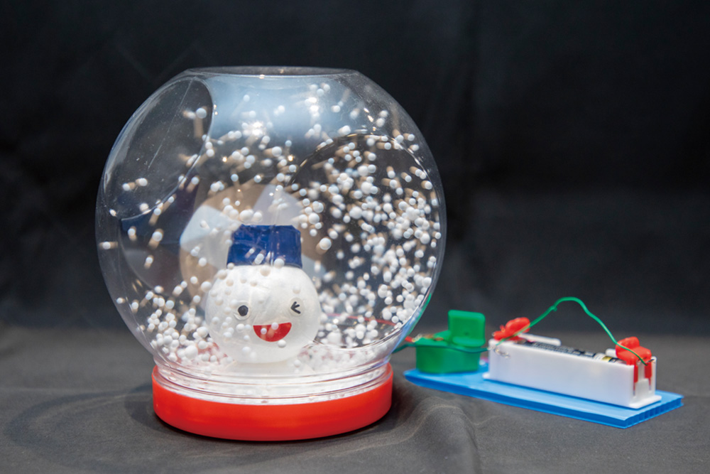 自分の作ったプロペラで、風を起こします。容器に入れて風のスノードームに仕上げます。
