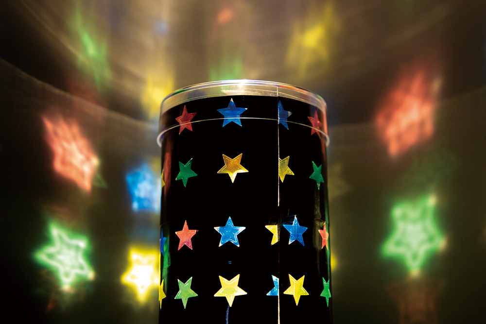 かげ作りを通して、光の不思議に迫ります。セロハンを使って色付きかげも作ります。カラフルな模様が浮かびあがるオリジナルライトに仕上げます。