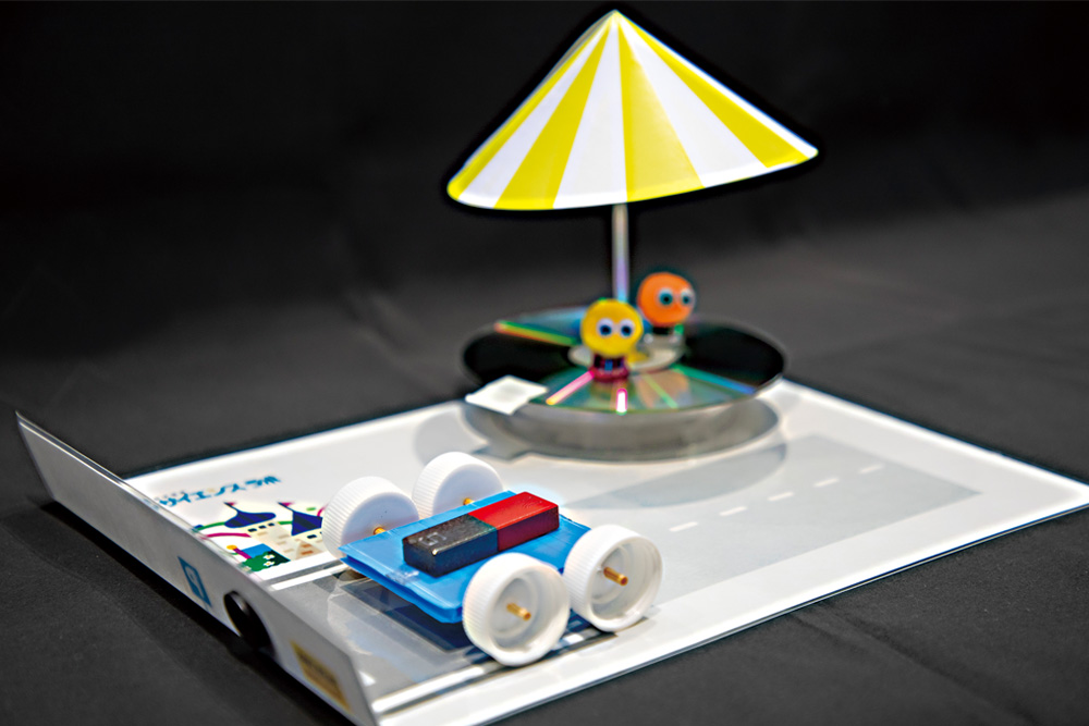 磁石の力で車を動かそう。駐車場にも磁石のしかけが隠れています。楽しい動きをするメリーゴーランドも作ります。