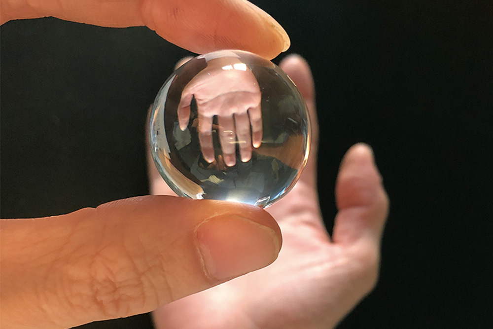 透明な球を通して不思議な見え方を観察します。大きく見えたり、ひっくりかえって見えたりします。