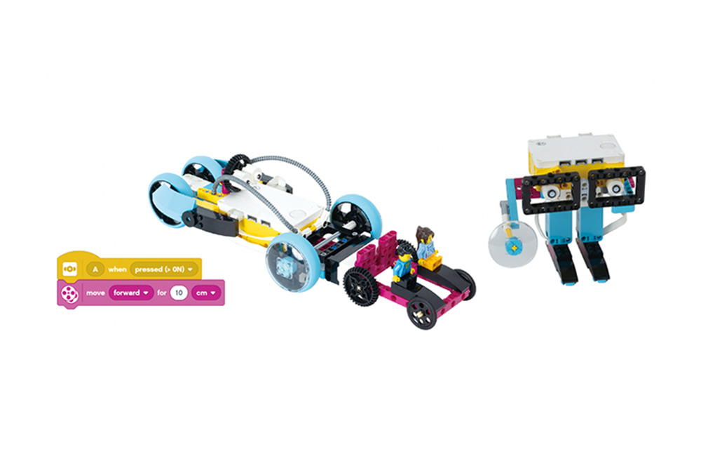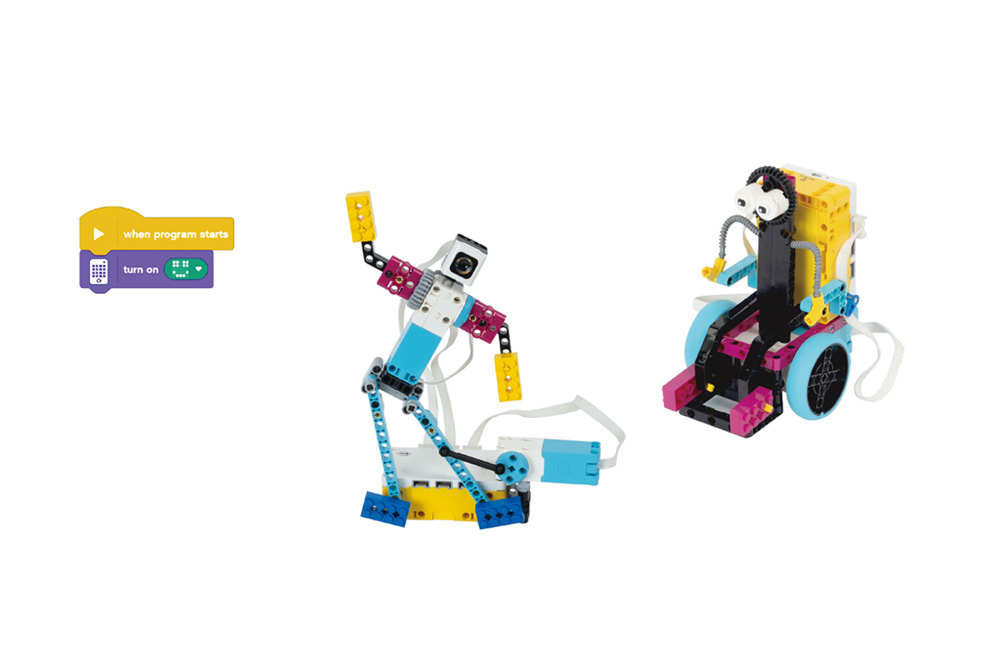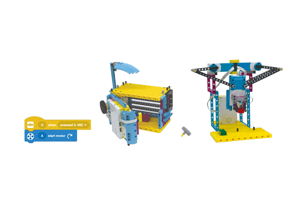 LEDマトリクスのついたハブやモーター、センサーと、新機能が加わったパーツで、短い時間でさまざまな組み立ての試行錯誤ができるプログラミング教材です。スクラッチベースのワードブロック型プログラミングソフトウェアを使って、文章を書く感覚でプログラムを組んでモデルを動かします。