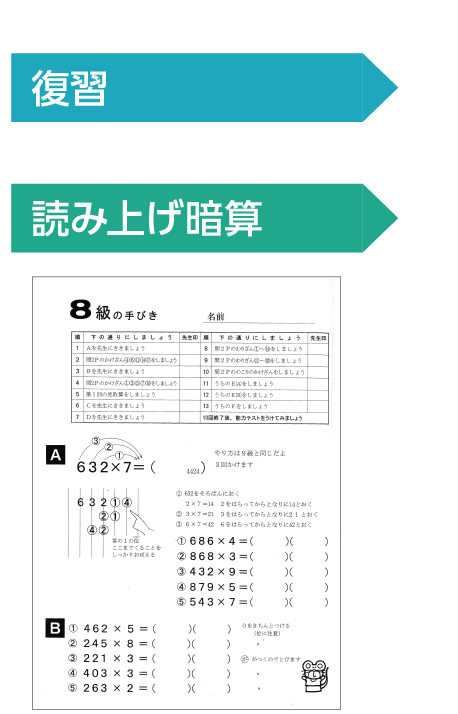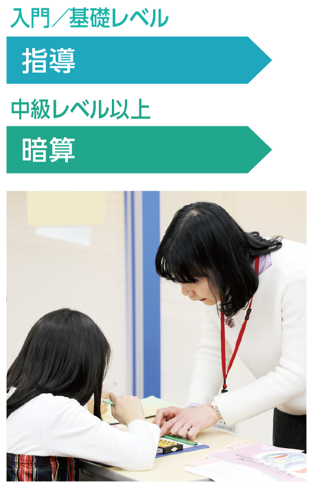 入門/基礎レベルでは「指導→復習→進級テスト」、「中級レベル以上」では「暗算→読み上げ暗算→珠算」となります。