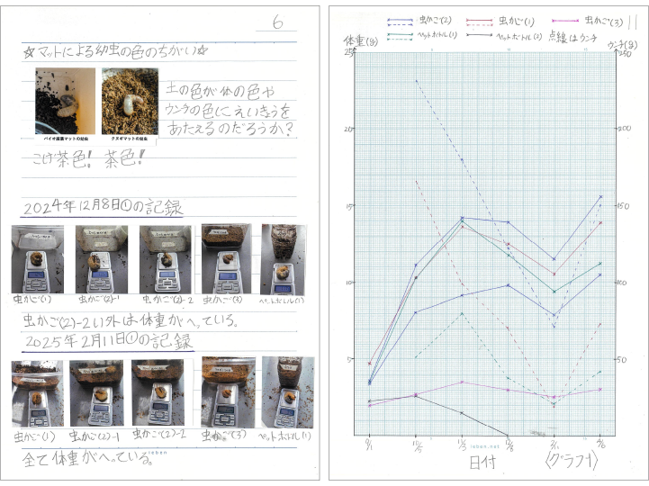 カブトムシの育てる環境を変えると成長した後の体重に変化があるのかを調べた実験です。土の種類や育てる容器、飼育する場所(温度)を変えて最後まで育て、それをグラフや表にして見やすくまとめています。
