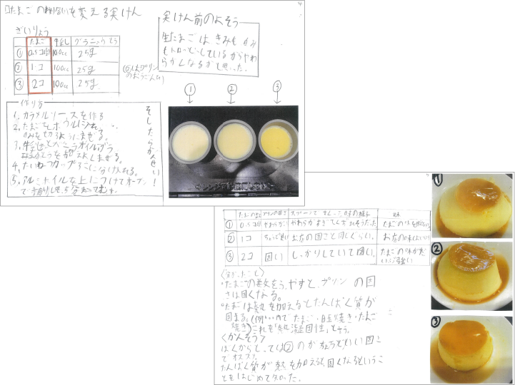 プリンの材料の割合を変えることで、プリンのやわらかさがどう変わるのかを調べている実験です。たまご、牛乳、グラニュー糖の量を変えてプリンをつくり、全部食べて結果を調べています。自分好みのかたさのプリンの割合も求めることもできました。