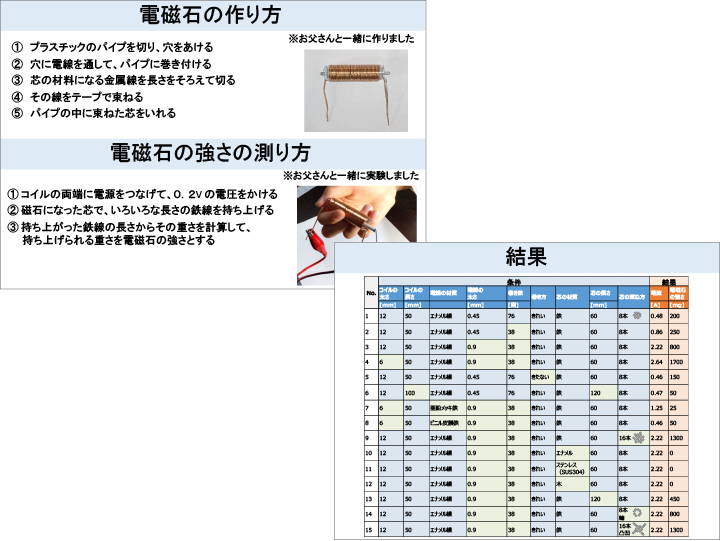 電磁石の条件を変えて、電磁石が強くなるのはどういうときか調べている実験です。15パターンも作成し全てを表にまとめているところは圧巻です。実験した結果、予想とちがっているところもあって驚きもあったようです。