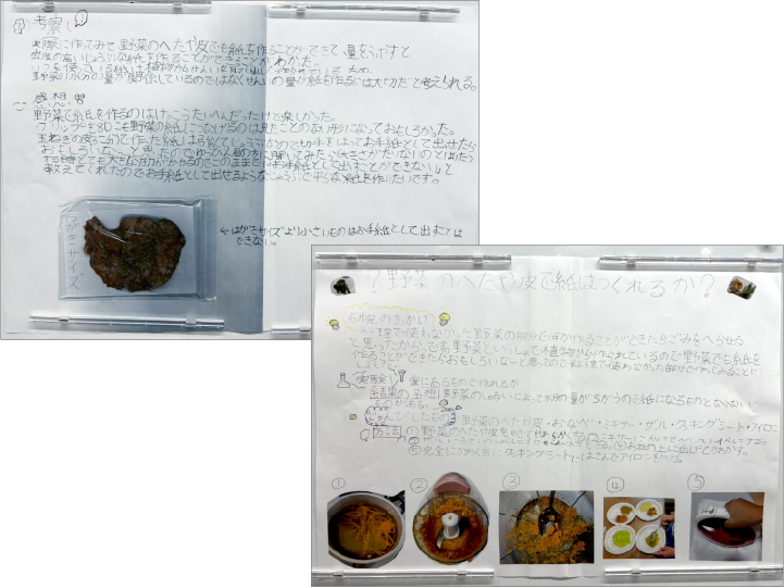 たくさんの種類の野菜のへたや皮から紙を作って、におい・手ざわり・字の書きやすさ・強さまで調べ、まとめている実験です。すべてを表にまとめて一覧としているところも見やすくする工夫がされています。