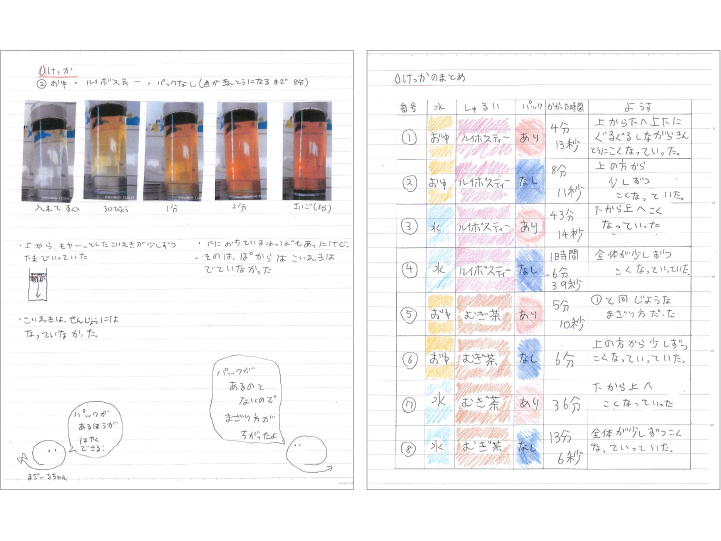 むぎちゃやルイボスティーがどのようにまざっていくのか、水とお湯のパターンや、お茶パックを使うかどうかで、まざっていく様子を細かく観察してまとめています。写真やグラフの色分けを駆使して分かりやすくまとめています。