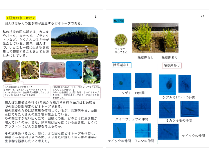 田んぼを再現したビオトープを作って、除草剤の影響を調べている実験です。何年も続けて行っており、今回はプランクトンの顕微鏡観察だけでなく、パックテストを行ったり、濁りを調べたりと、レベルアップした研究になっています。