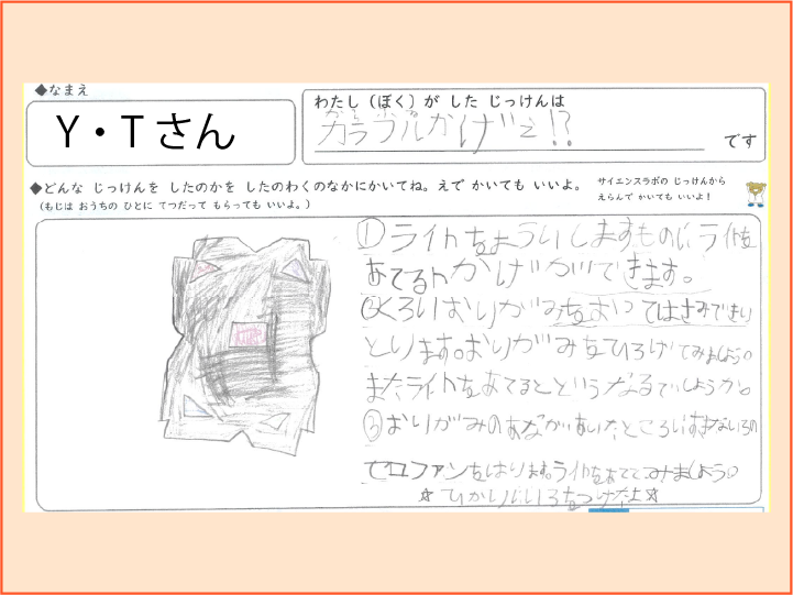 サイエンスラボで8月に実験したことをしっかりと自分のことばでまとめてくれています。カラーセロハンを使って、カラフルなかげえを楽しんでくれたことがわかる作品です。
