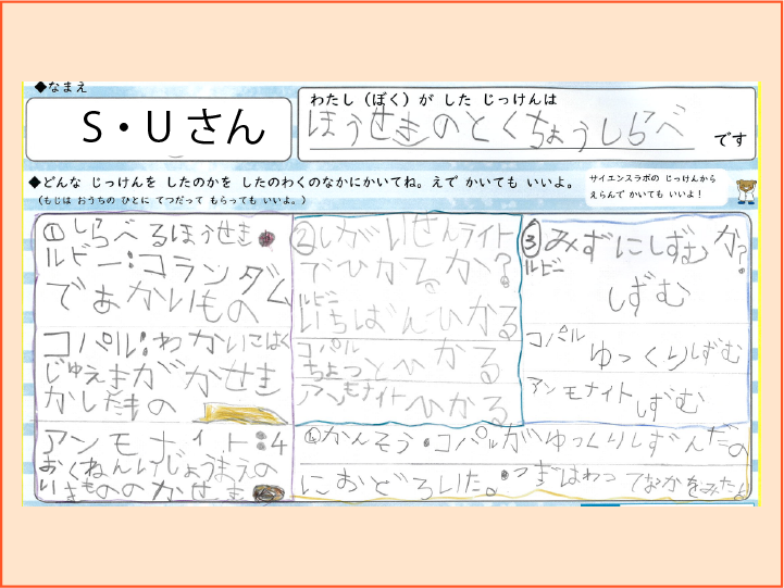 3つの宝石が紫外線ライトを当てて光るのか、また、水に沈むのかを調べる実験です。それぞれの結果も分かりやすくまとめて書くことができています。