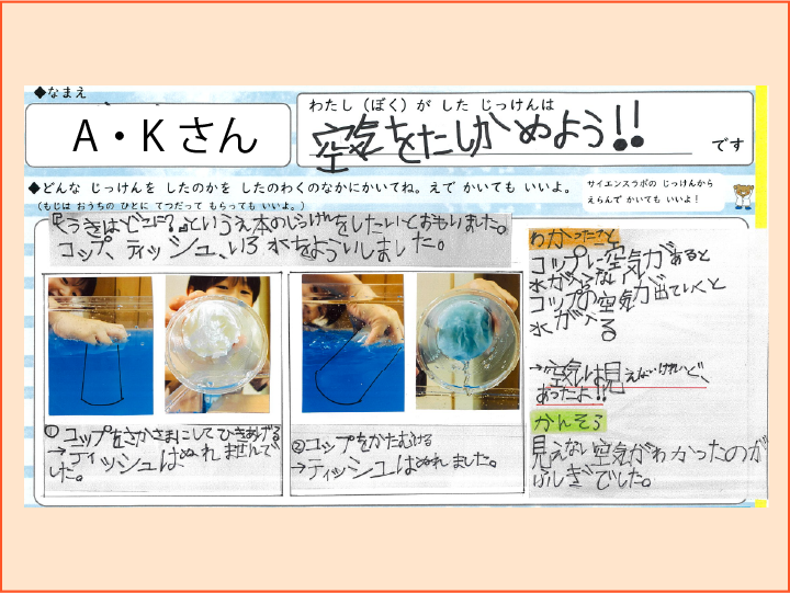 コップを逆さまにして水に入れた時、コップの底のティッシュが濡れたかどうかで、空気の存在を確かめました。写真も使って分かりやすくまとめられています。