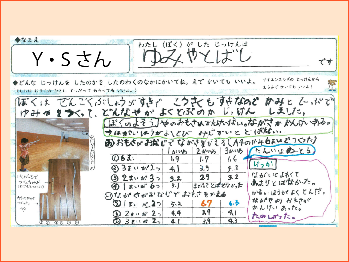 弓矢を自分で作り、矢の長さや重さを変えたときに飛ぶ距離を調べた実験です。それぞれ何回も行い、結果を表にして見やすくまとめてくれています。