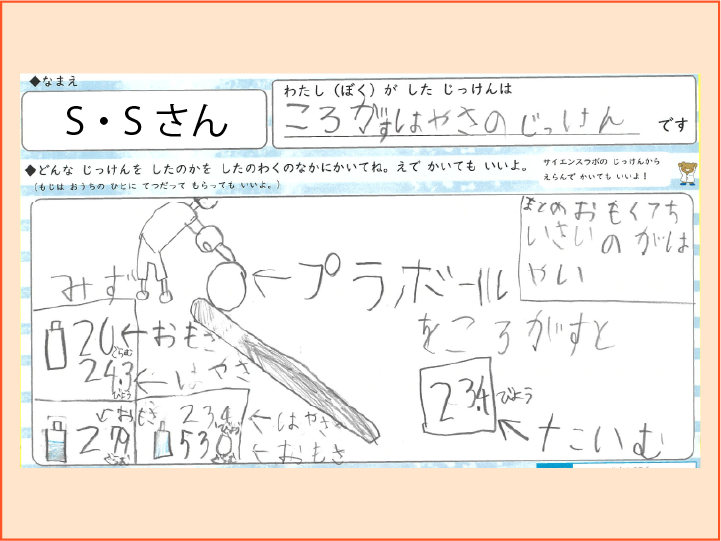 いろいろな重さで坂をころがしたときの速さを調べている実験です。実験して分かったことは、重くて小さいものがタイムが速かったようです。
